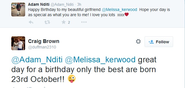 Kupitia ukurasa wa Twitter, Adam amemwandikia mrembo huyo ujumbe huu kumpongeza kwenye siku yake ya kuzaliwa: Happy Birthday to my beautiful girlfriend @Melissa_kerwood Hope your day is as special as what you are to me! I love you lots.